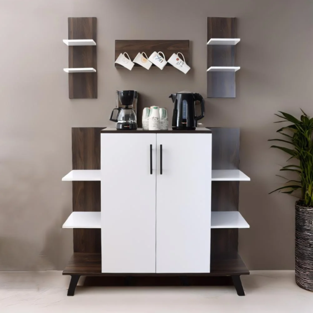 ركن قهوة خشبي ماليزي للمنزل – 3 أدراج ورفوف معلقة لون بني وأبيض
